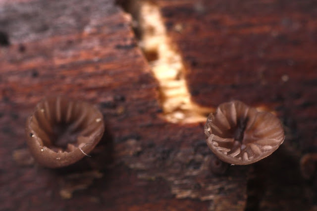 CARPÓFORO muy pequeño, en forma de concha, campana invertida o disco, de menos de 1 a 1,5 cm de diámetro, con los bordes sinuosos u ondulados por las láminas, con superficie marrón grisácea o marrón clara poco visible ya que es por la que se sujeta sin ningún pie de manera que lo que se ve a primera vista son las LAMINAS dispuestas de manera circular, muy espaciadas y relativamente gruesas para su tamaño, de muy diversas longitudes, marrón grisáceas como el resto del sombrero, con arista más clara. CARNE muy fina gelatinosa, sin olor ni sabor apreciable. ESPORADA en masa blanca.
